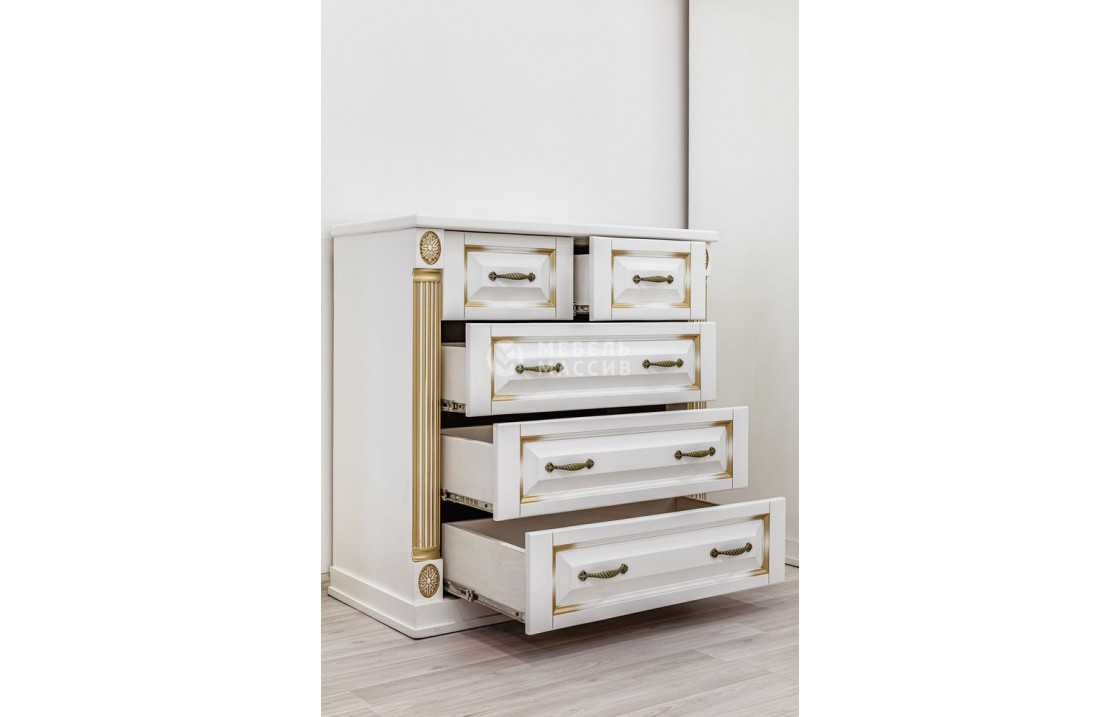 Комод Пальма (белая эмаль с золотой патиной) вдохновлён архитектурой эпохи классицизма, на что указывает стилизованная под античные колонны резьба. изделие имеет устойчивое основание и 5 выдвижных ящиков (3 больших и 2 средних). купив его в интернет-магазине по выгодной цене, вы сможете облагородить интерьер любого помещения.| Размер | Цена | |